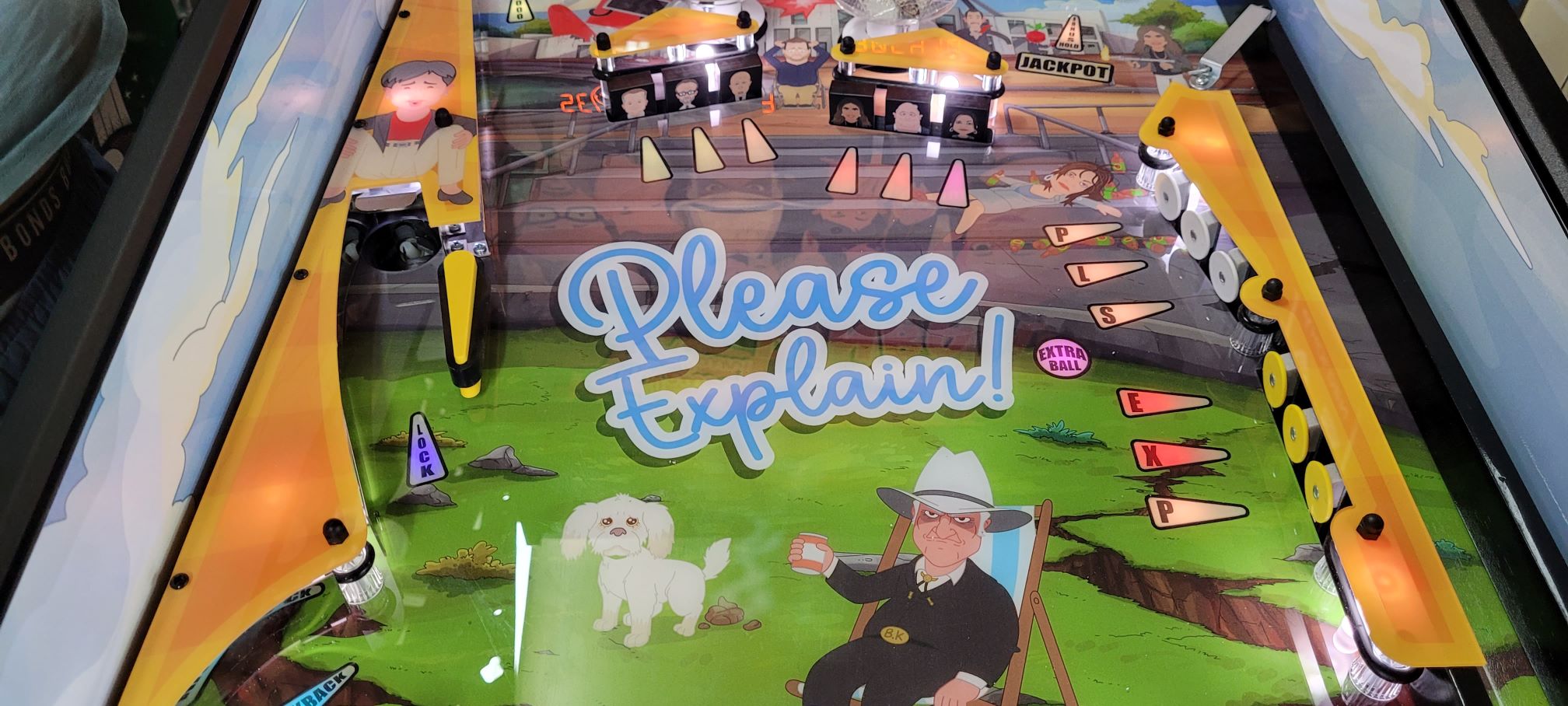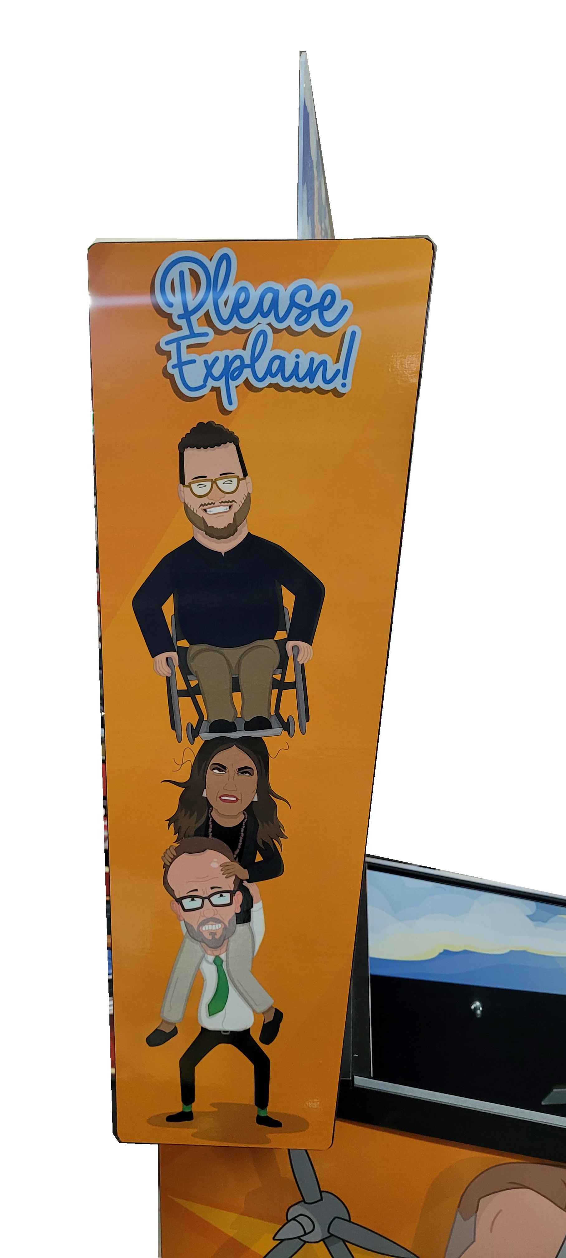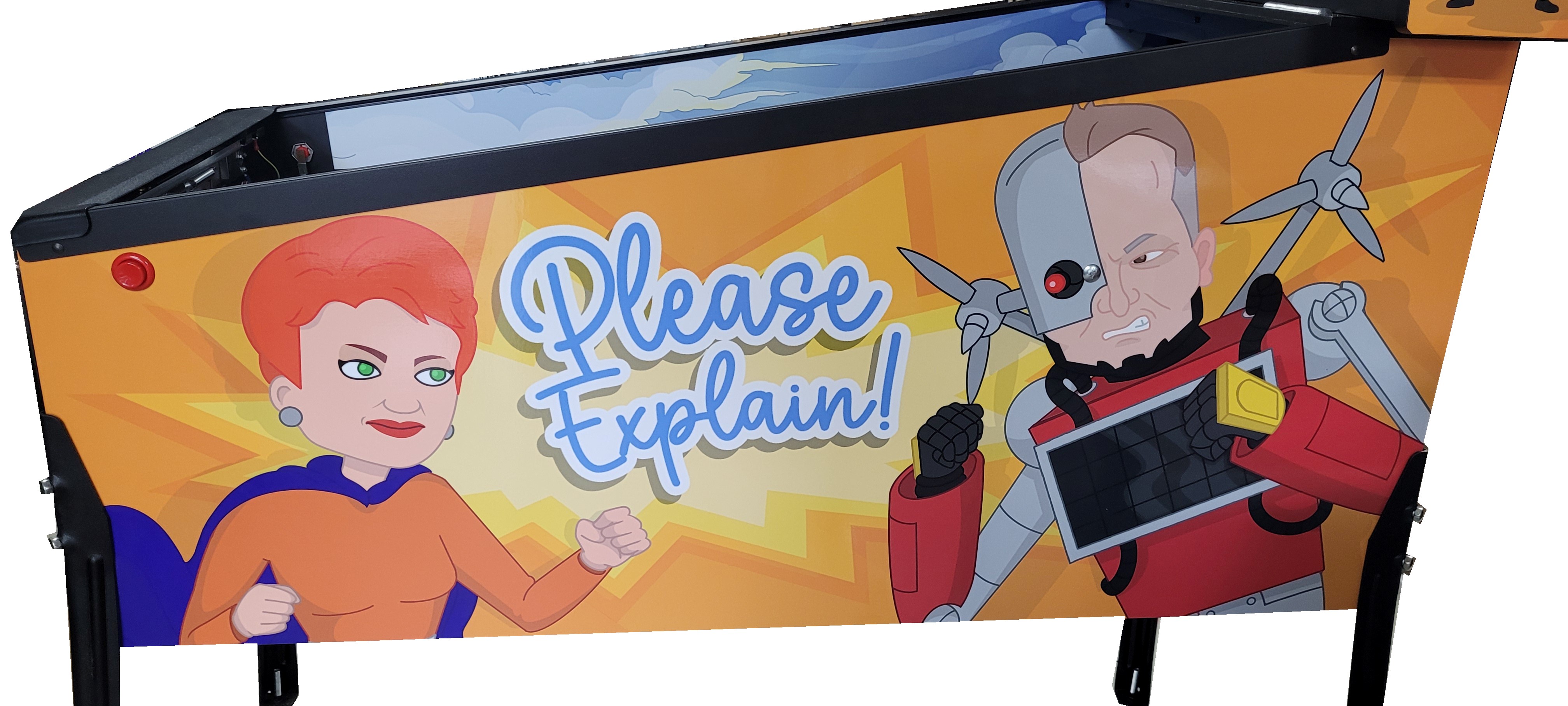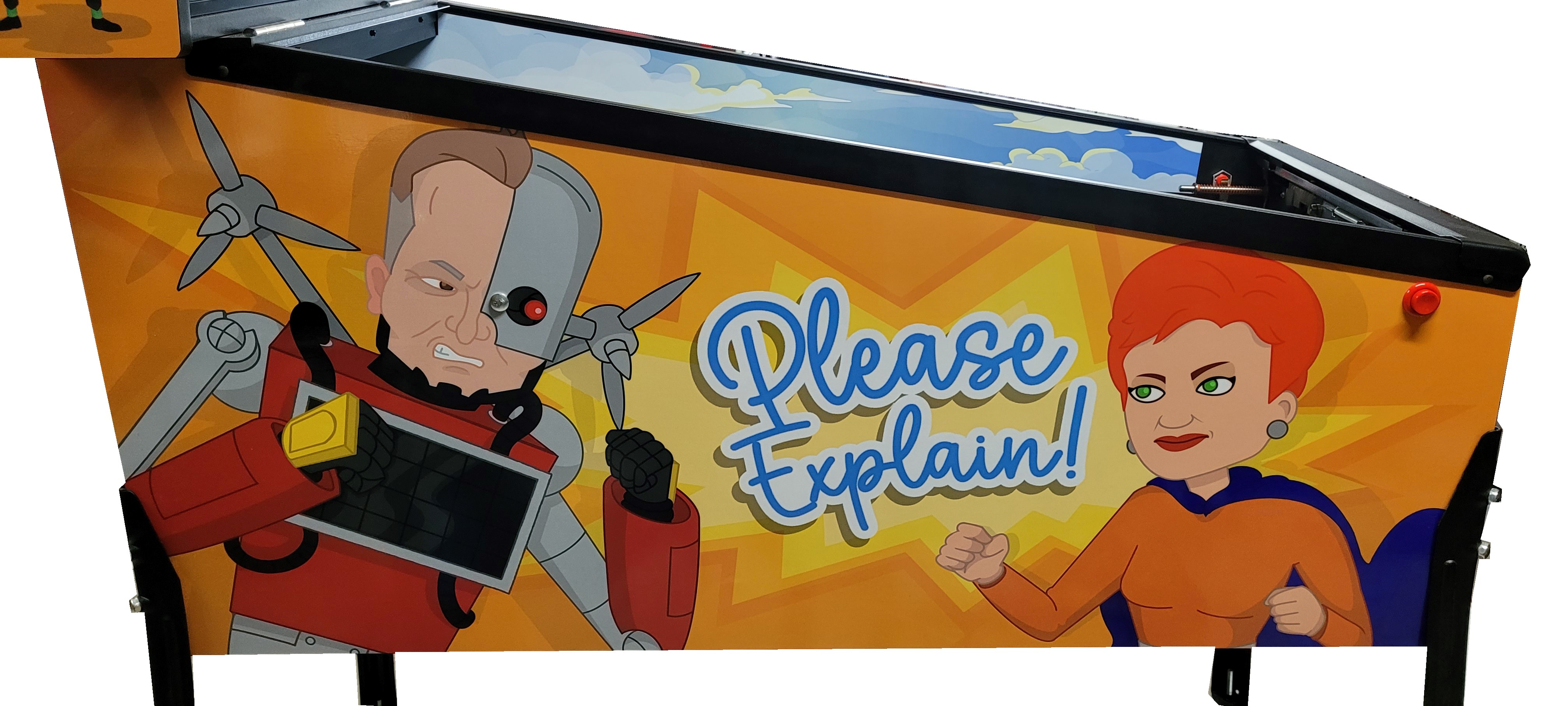 This Custom Pinball game is a “one off” version that was created/based on the 3 seasons of the very popular “Please Explain” Animation Series, Click “HERE” for more on that. We were able create an interactive piece of playable art from the graphics, music, sound effects and voice call outs from the series. It was later Auctioned off at a major event and sold to one lucky person.