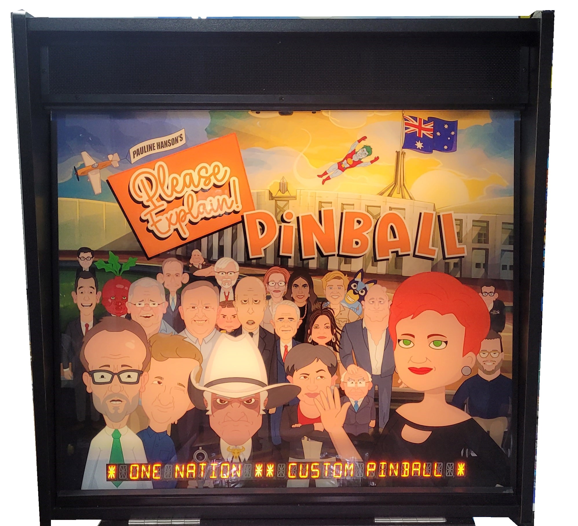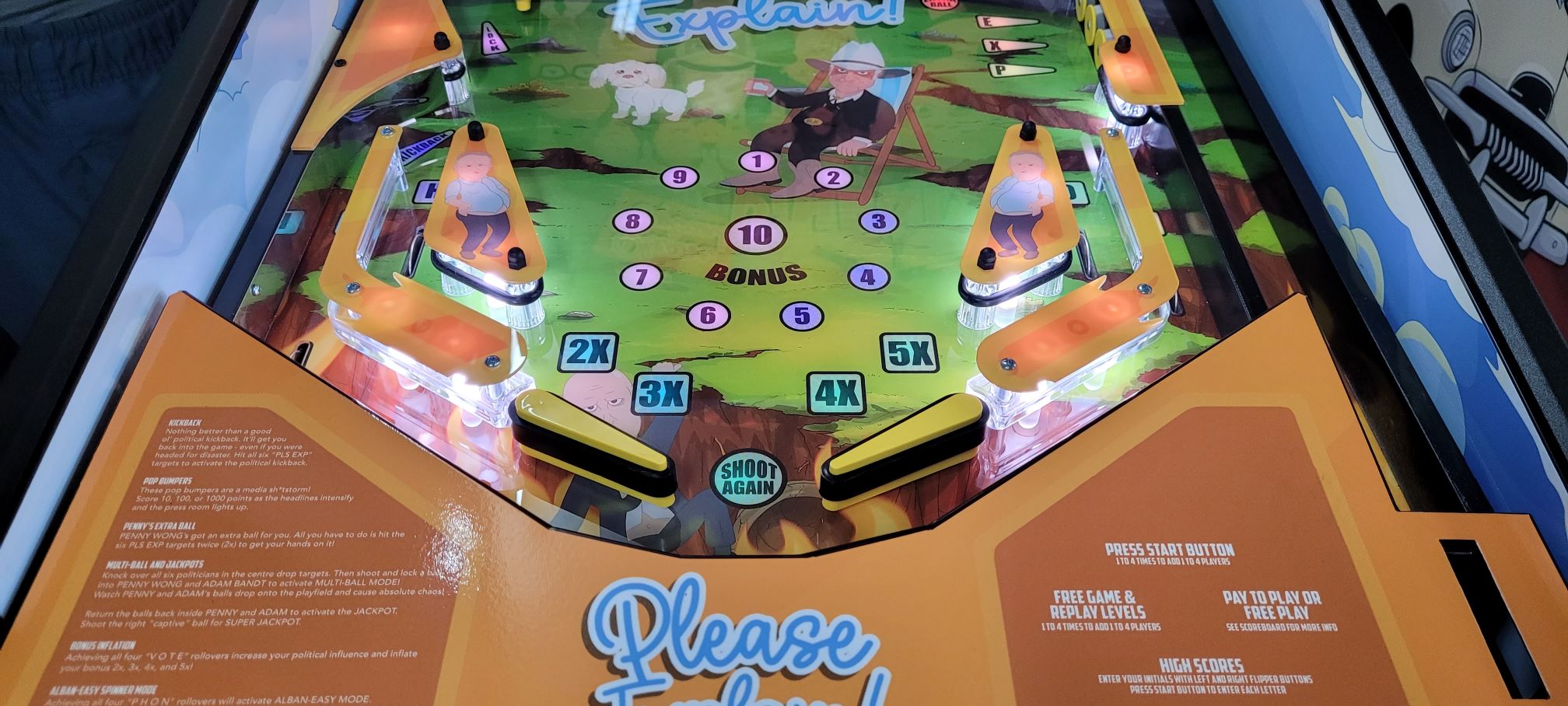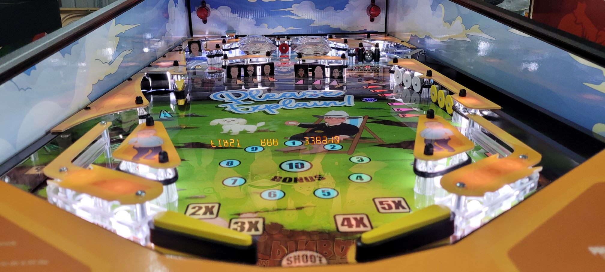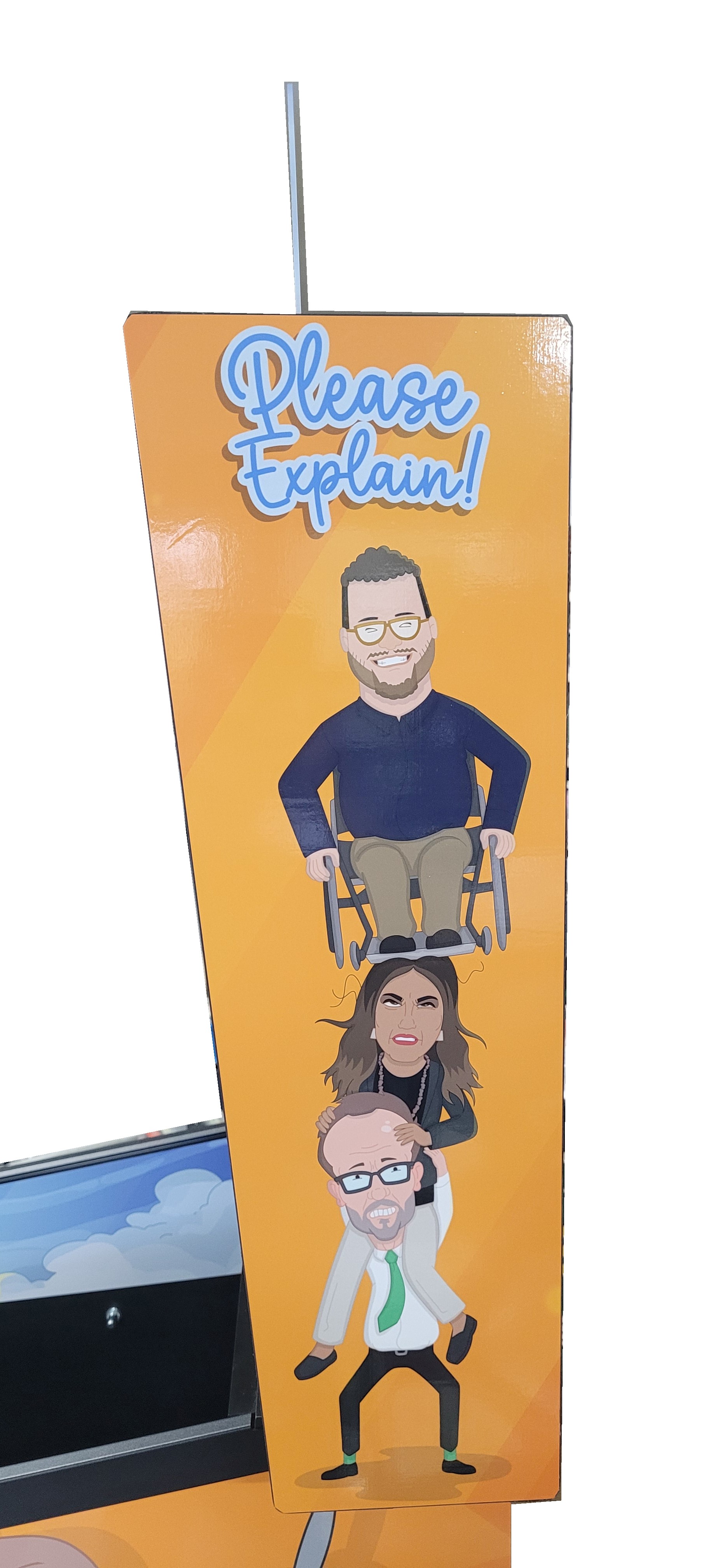 This Custom Pinball game is a “one off” version that was created/based on the 3 seasons of the very popular “Please Explain” Animation Series, Click “HERE” for more on that. We were able create an interactive piece of playable art from the graphics, music, sound effects and voice call outs from the series. It was later Auctioned off at a major event and sold to one lucky person.