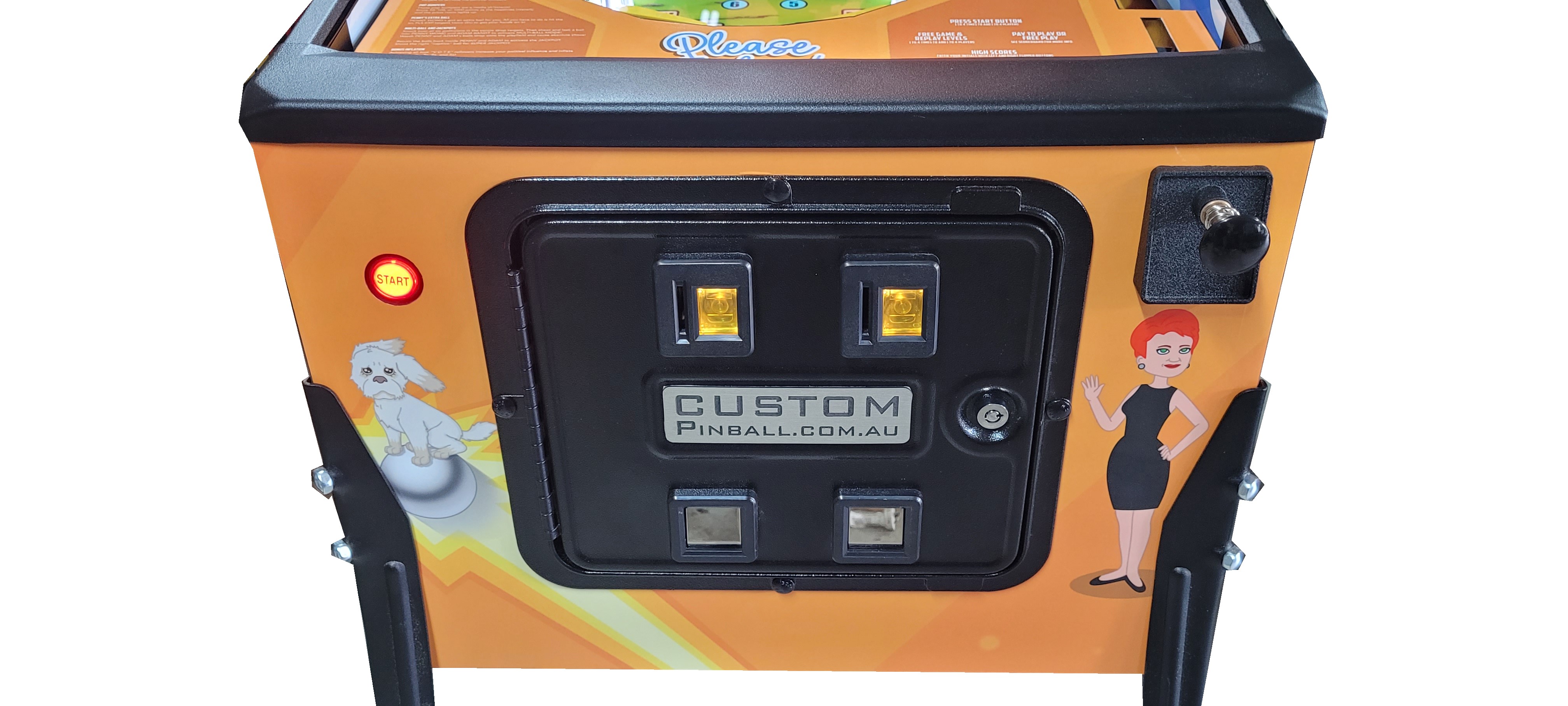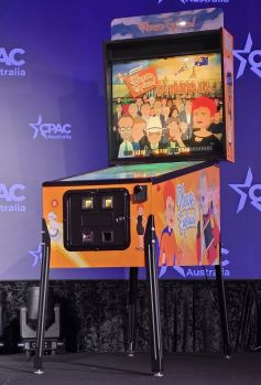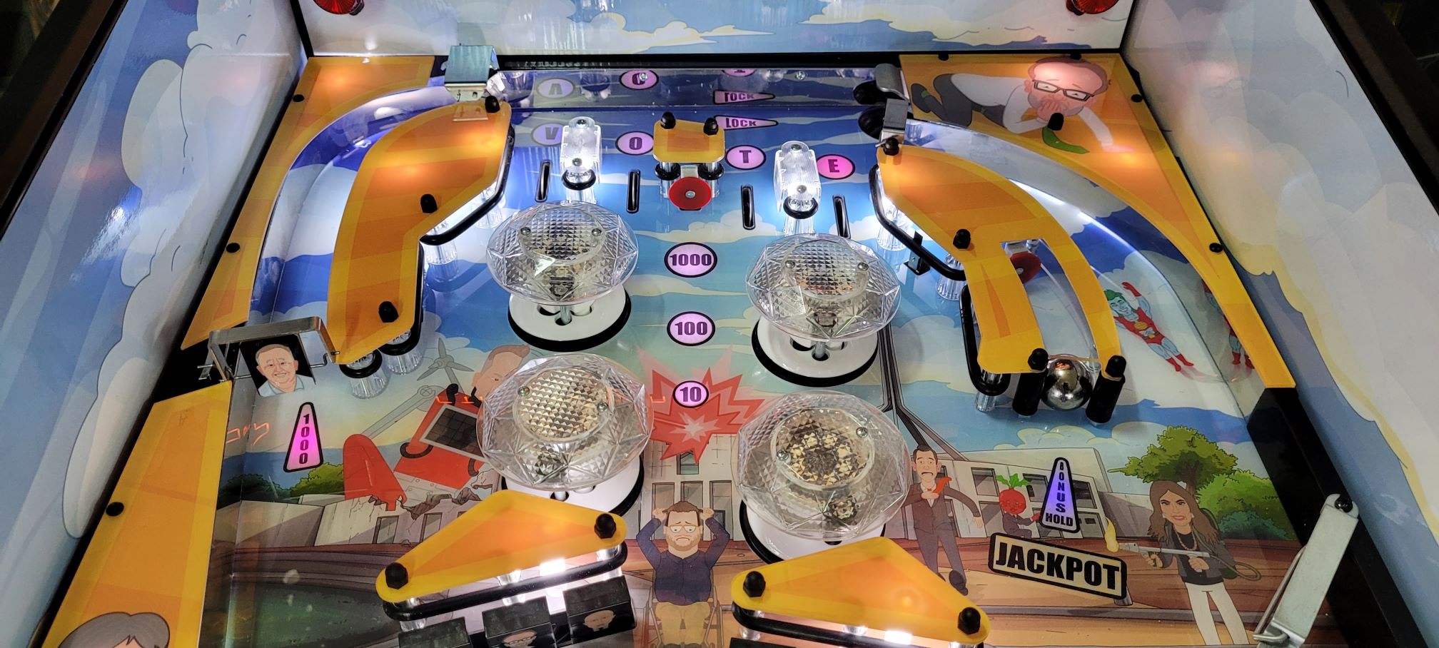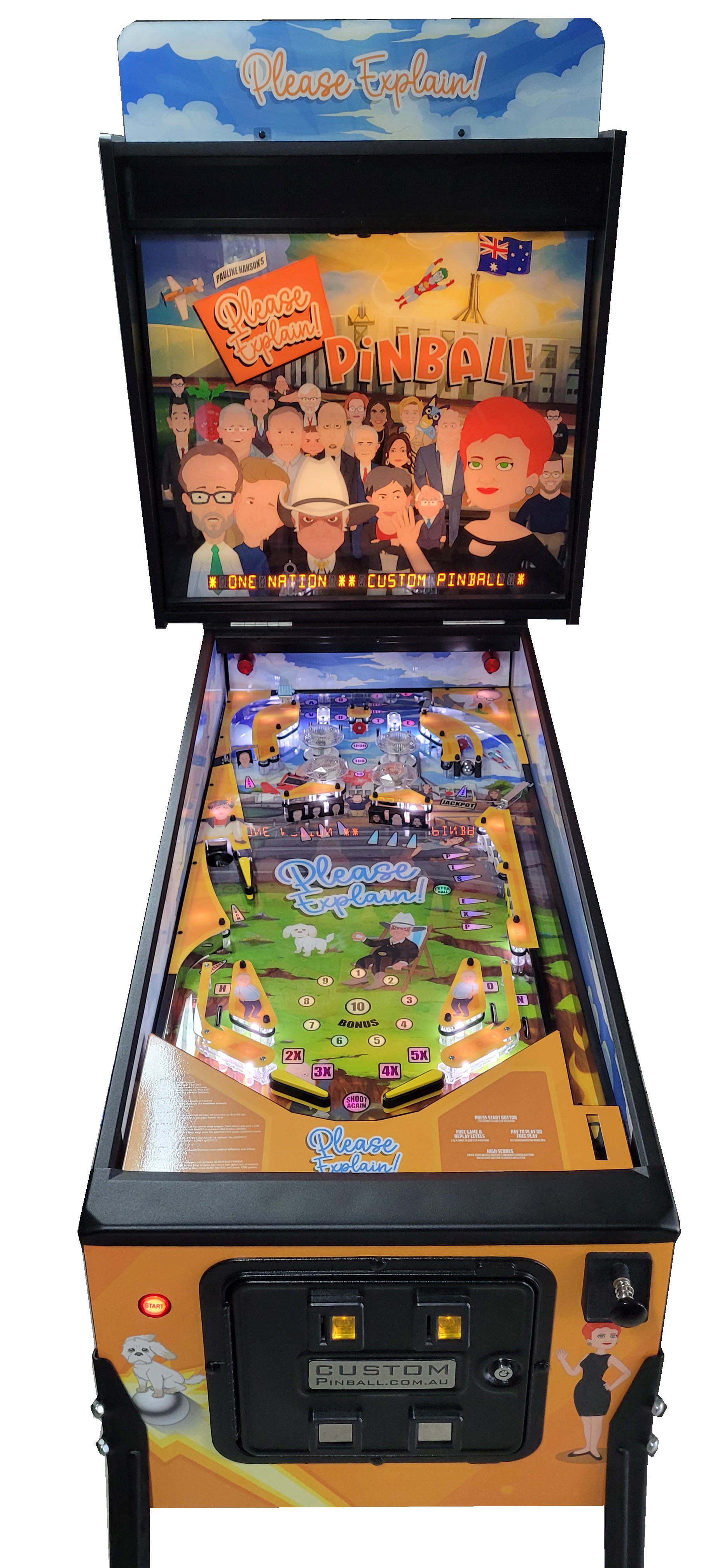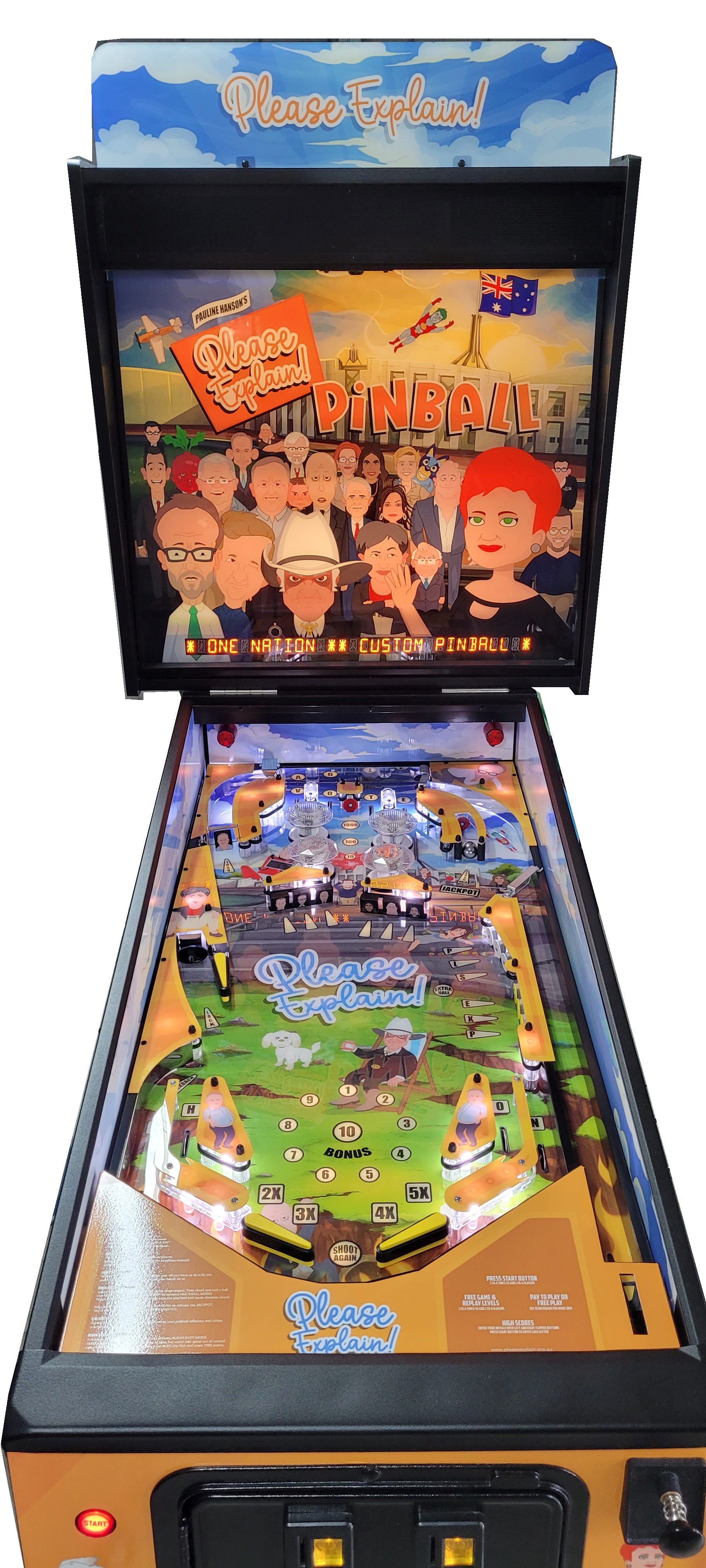 This Custom Pinball game is a “one off” version that was created/based on the 3 seasons of the very popular “Please Explain” Animation Series, Click “HERE” for more on that. We were able create an interactive piece of playable art from the graphics, music, sound effects and voice call outs from the series. It was later Auctioned off at a major event and sold to one lucky person.